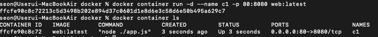 docker container run -d --name c1 -p 80:8080 web:latest- 호스트의 80번 포트로 들어오는 요청을 컨테이너의 8080으로 향하게 한다.