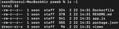 app.js와 package.json 등 node.js 앱을 만들기 위한 파일들과 Dockerfile이 있다.