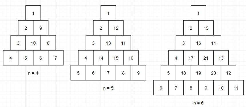 이렇게 밑변의 길이와 높이가 n인 삼각형이 테두리부터 시계 반대방향으로 숫자가 1부터 시작해서 1씩 증가하며 채워집니다.
