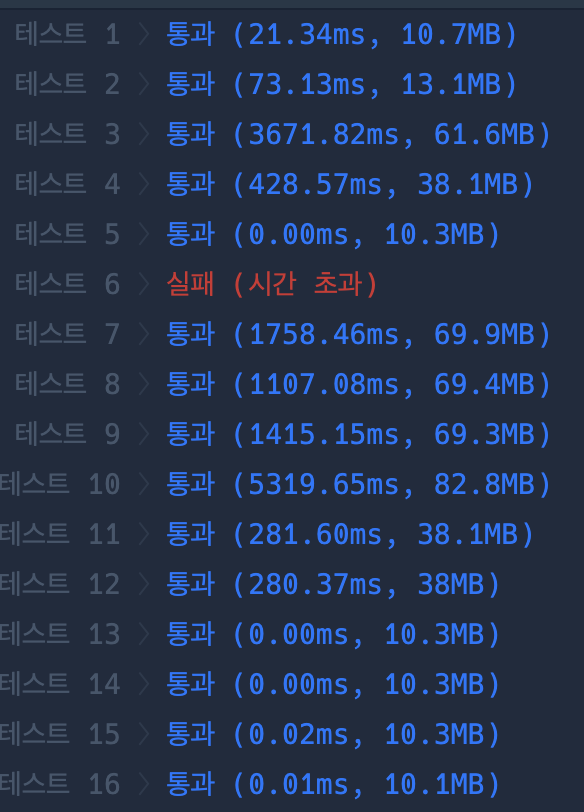 결과는 테스트 6에 대해 시간 초과하고 나머지는 전부 통과하였습니다.