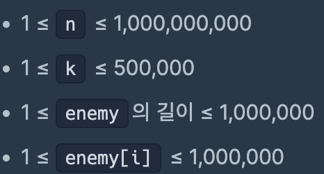 n이 10억인 점은 문제가 되지 않지만 enemy가 100만이기 때문에 O(N)이나 O(NlogN) 과 같이 (N^2)을 넘지 않는 시간복잡도 풀이가 필요합니다.